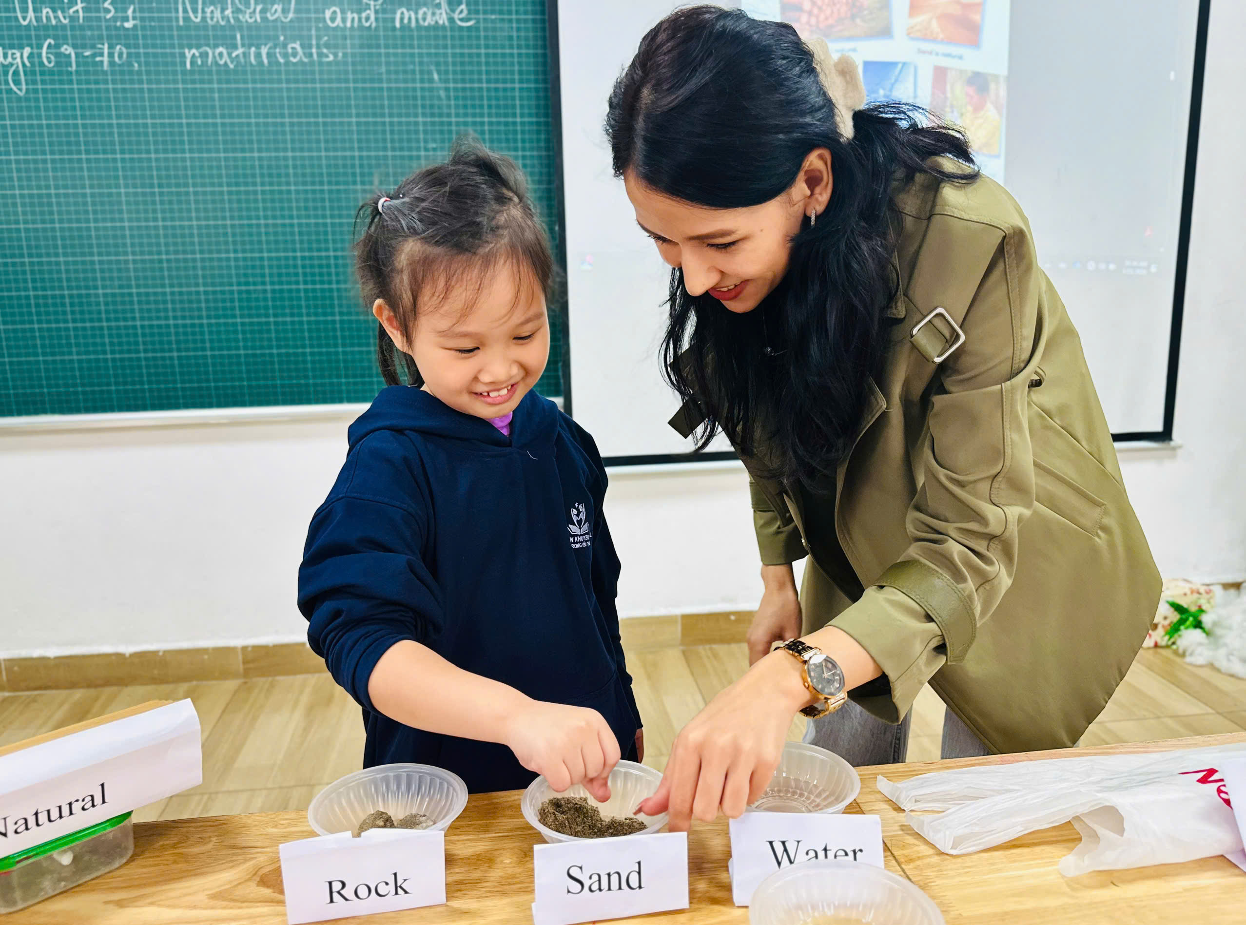 Thay vì nhìn hình ảnh trong sách giáo khoa, các bạn học sinh được tận tay cầm nắm những nguyên liệu thô sơ nhất từ tự nhiên như: Gỗ, Dầu, Cát, Đá, Nilon,…Vậy là những tính từ Tiếng Anh phức tạp bỗng trở nên thật dễ hiểu như Rough" (xù xì), "Smooth" (mịn), "Heavy" (nặng)....Việc kết nối trực tiếp giác quan với vật thể giúp các em ghi nhớ từ vựng nhanh hơn.