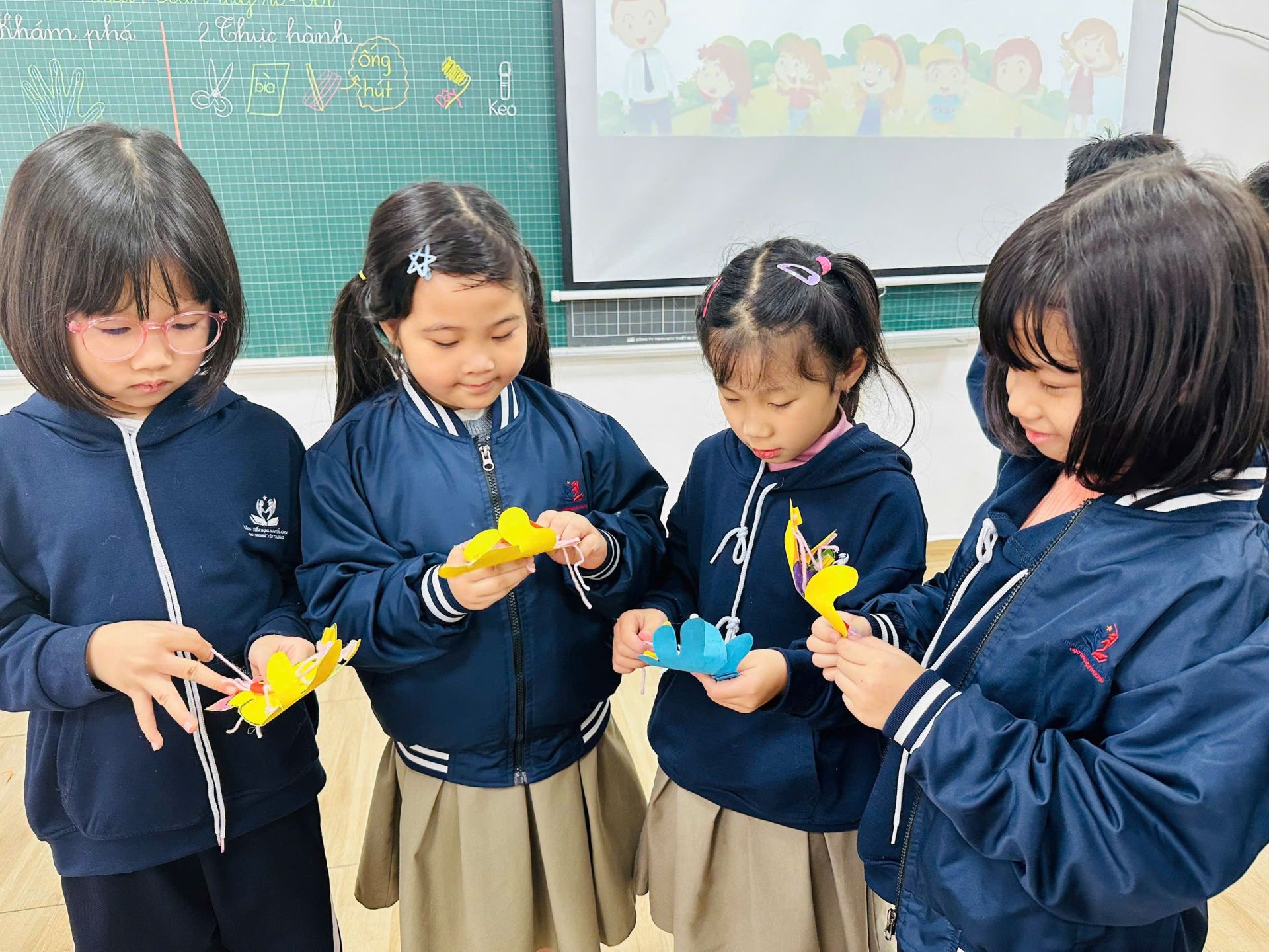 Các bạn học sinh lớp 1A2 đã rất hào hứng và thích thú khi làm bàn tay robot của mình có thể cử động. Dưới sự hướng dẫn của cô giáo, các bạn nhỏ đã tìm hiểu cấu trúc của bàn tay, cách các ngón tay di chuyển, sau đó từng bước lắp ráp các phần của bàn tay robot từ những vật liệu đơn giản như ống hút, dây, giấy cứng.