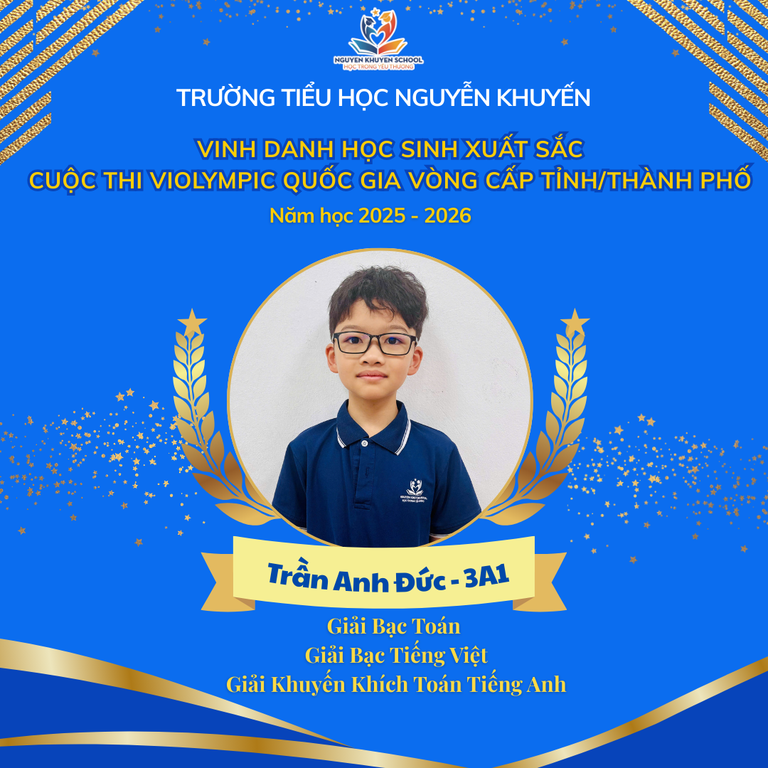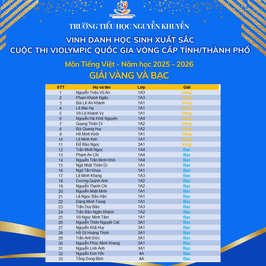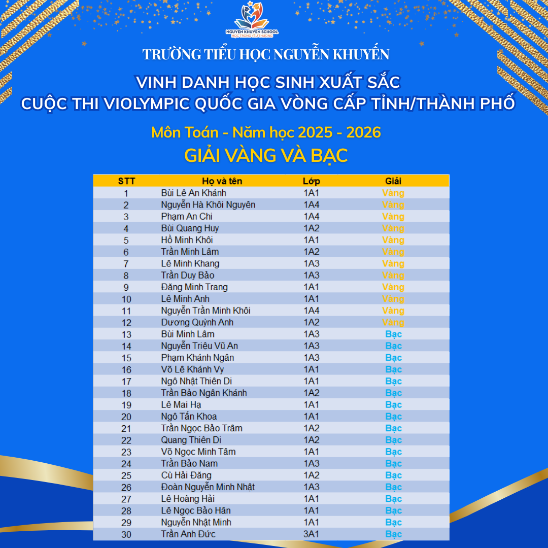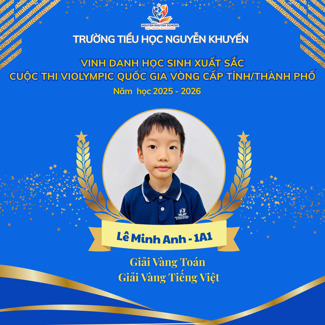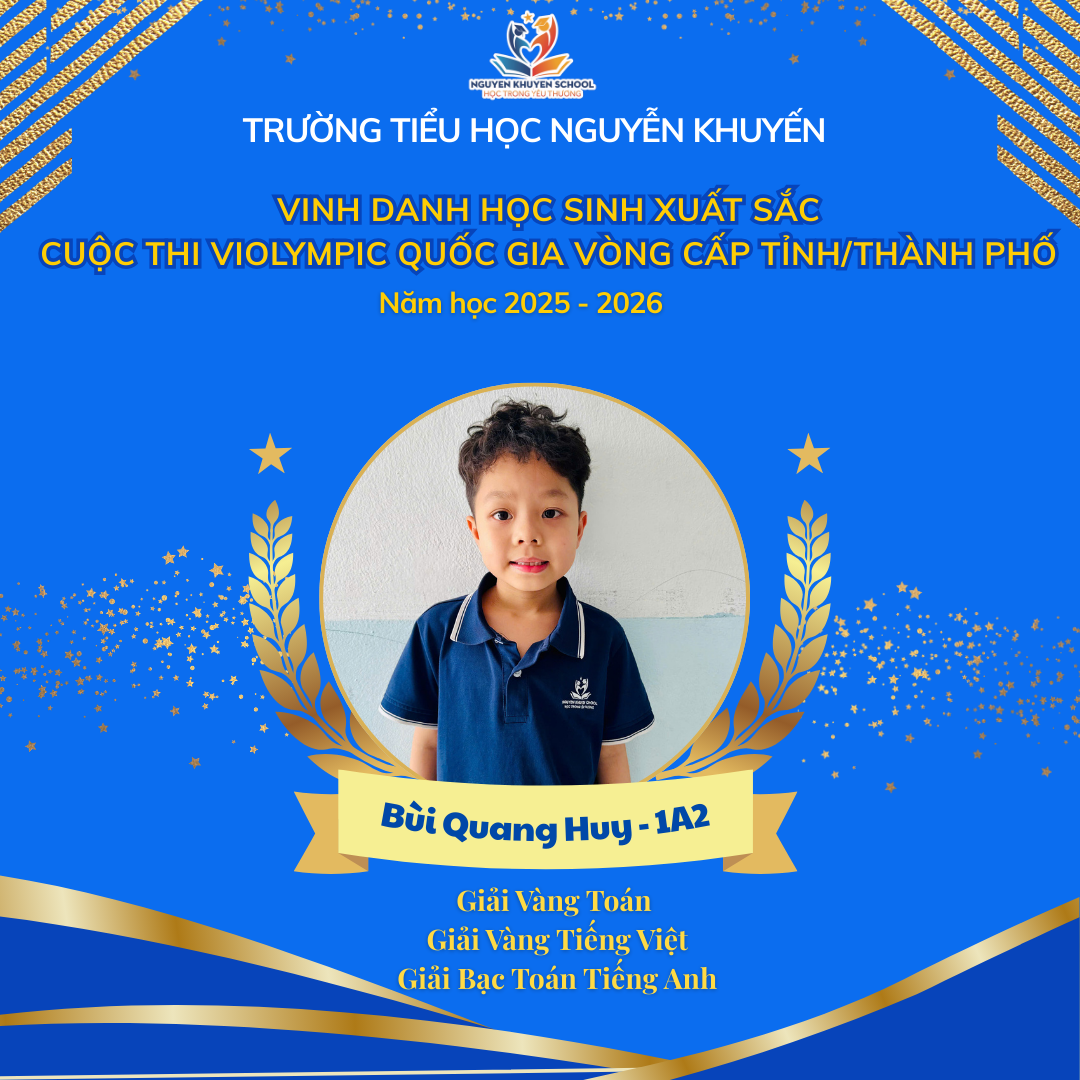 Vượt qua những giây phút so tài đầy gay cấn và kịch tính, các bạn nhỏ trường Nguyễn Khuyến đã xuất sắc rinh về "cơn mưa giải thưởng". Nhà trường xin chúc mừng những gương mặt vàng đã xuất sắc chinh phục Violympic cấp Tỉnh/Thành phố năm học 2025 - 2026.