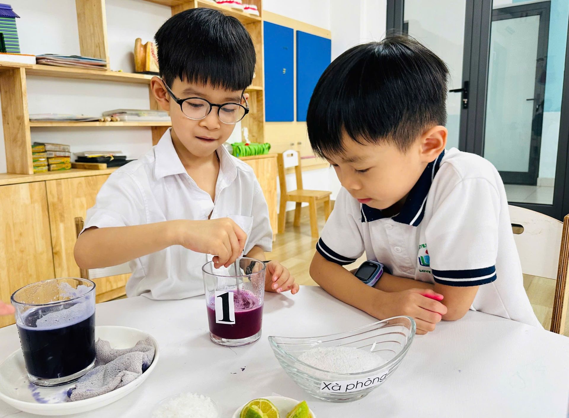 Khoa học là một thế giới kỳ diệu, dẫn dắt các con mở cánh cửa và khám phá những điều bất ngờ. Với tiết học thí nghiệm “Sự biến đổi màu của nước bắp cải tím”, các bạn học sinh được cùng nhau thực hành và hiểu rõ hơn về sự biến đổi màu sắc khi trộn với các chất khác như: muối, xà phòng, chanh, nước lọc.