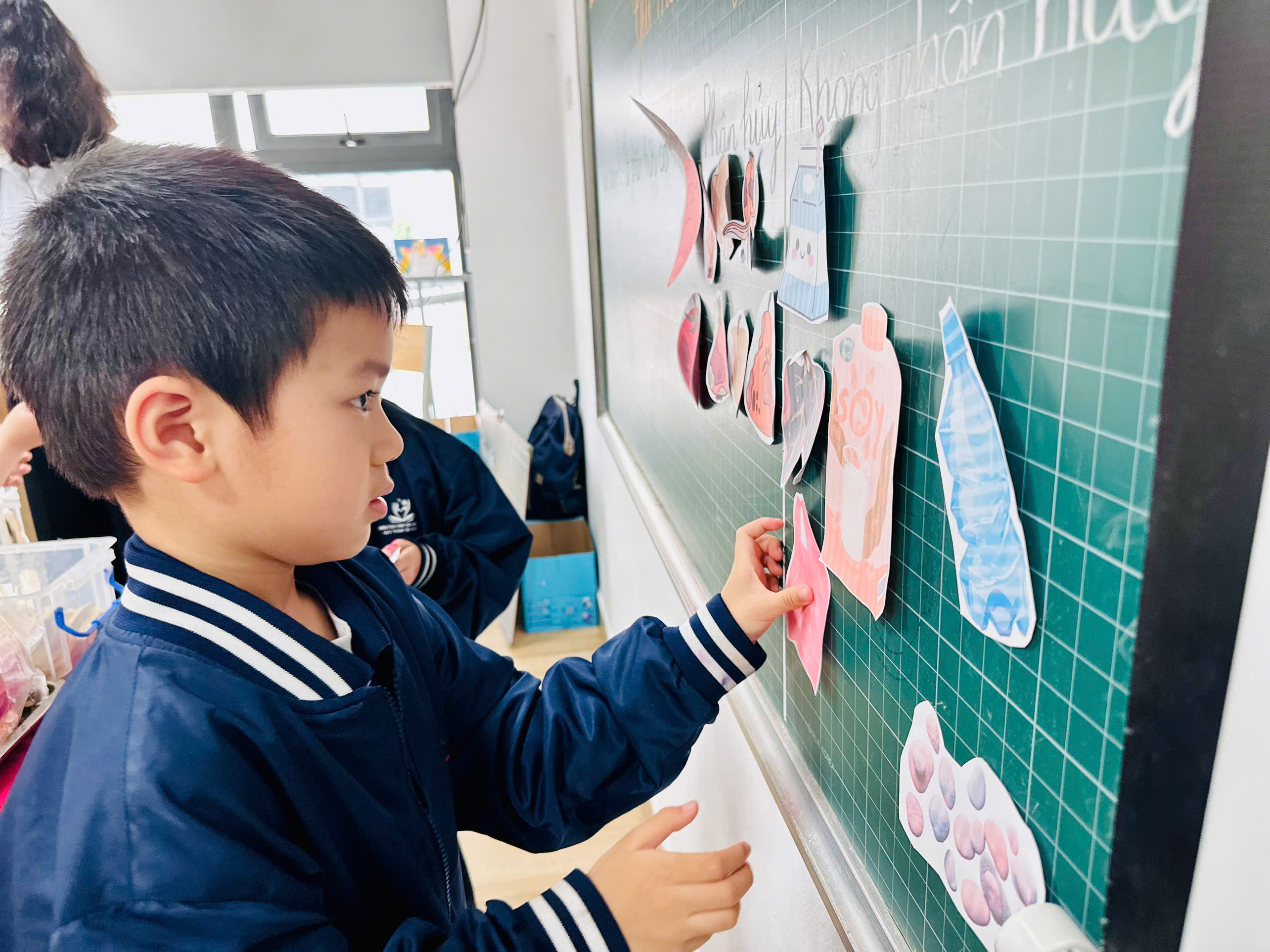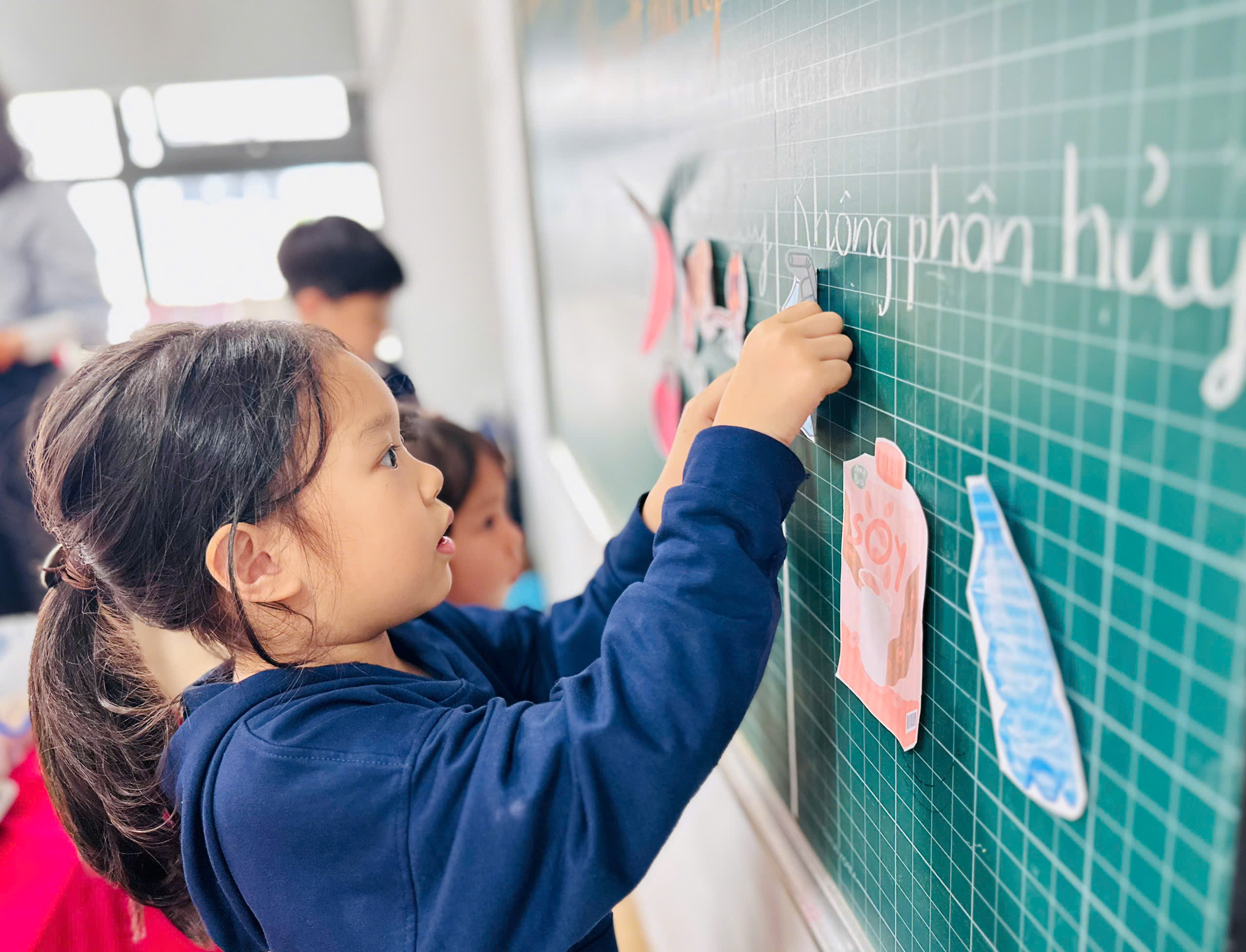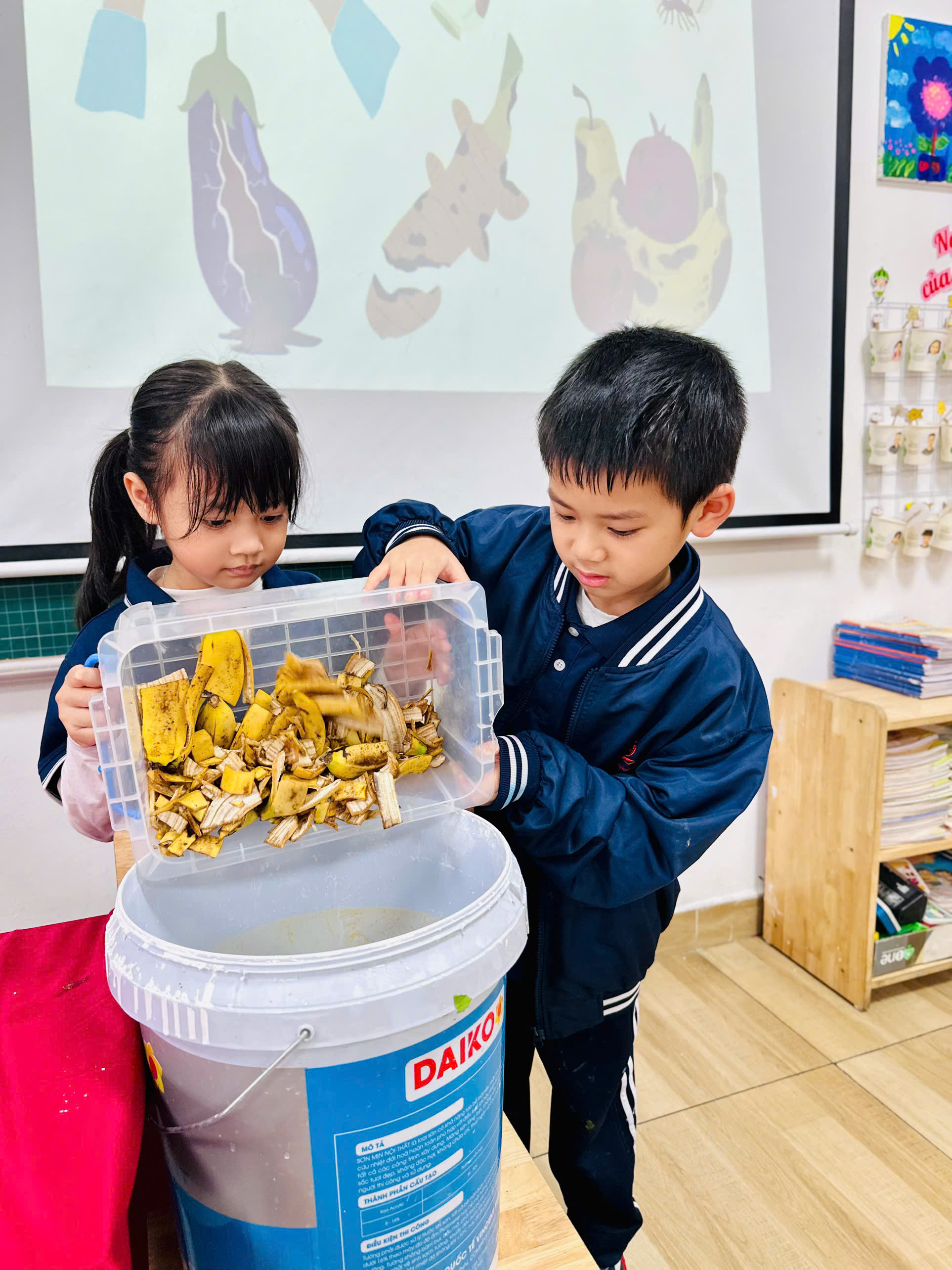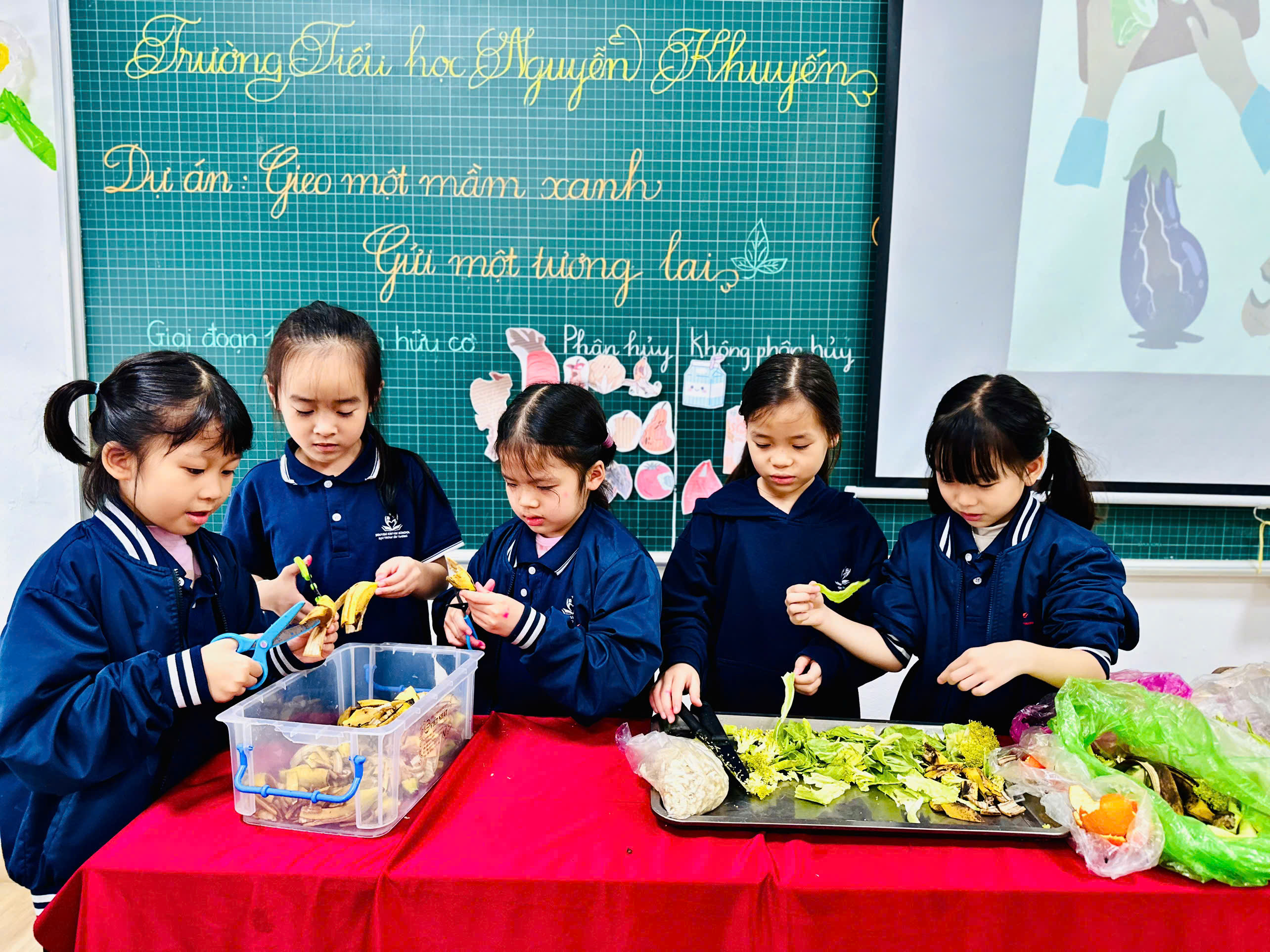 Thay vì vứt vào thùng rác, các em đã cùng nhau gom nhặt những mẩu rau thừa, vỏ củ quả từ bữa ăn tại nhà và ở trường. Dưới những đôi mắt tròn xoe, các em học cách gom góp những “người bạn rau củ” để bắt đầu quy trình ủ phân. Dưới sự hướng dẫn của các thầy cô, những đôi tay nhỏ nhắn bắt đầu học cách ủ phân hữu cơ.