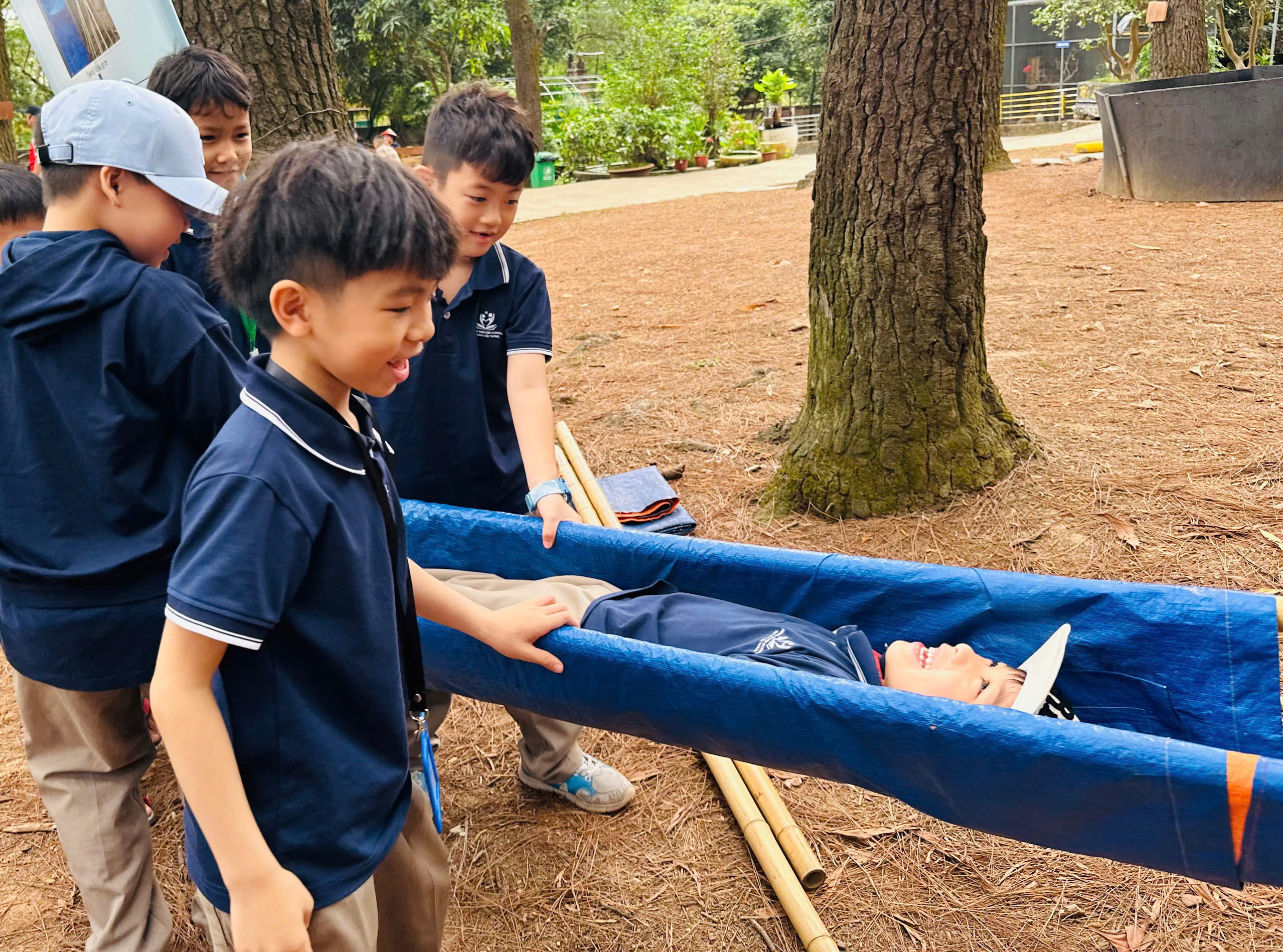 Các em học sinh Nguyễn Khuyến còn dắt túi được một rổ kỹ năng sinh tồn siêu hữu ích từ các chuyên gia đấy nhé. Kĩ năng nhóm lửa, sơ cứu vết thương và làm cáng. Các bạn nhỏ nghiêm túc học cách băng bó, phối hợp nhịp nhàng để khênh "thương binh" trên chiếc cáng tự chế.